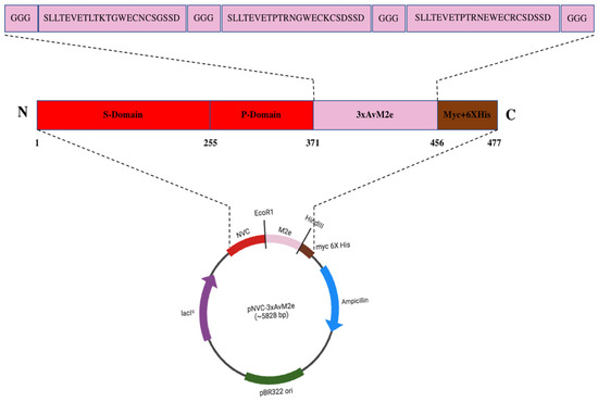 Figure 1 illustrates the plasmid pNVC-3xAvM2e construct, where the insertion was performed at the carboxyl- terminus of the NVC P-domain in pTcHis-TARNA2. A linker consisting of three glycine residues was added at both terminal ends and between each M2e sequence.