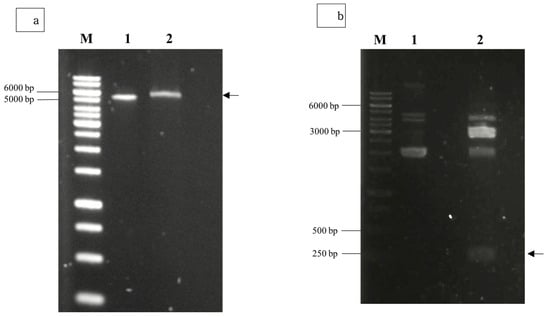 Restriction enzyme digestion using EcoRI and HindIII for (a) pTcHis-TARNA2 plasmid, and (b) pUCIDT-Amp plasmid carrying the 3xAvM2e gene. Lane 1, undigested plasmids; lane 2, digested plasmids. Arrows indicate the sizes of the digested pTrcHis-TARNA2 (5600 bp) and the coding region of 3xAvM2e (260 bp). Lane M, DNA ladder marker (Promega, San Luis Obispo, CA, USA).