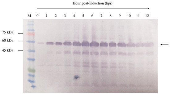 A 12 h time-course experiment was conducted to determine the optimal expression level of NVC-3xAvM2e in E. coli TOP10 cells. Upon IPTG induction, recombinant NVC-3xAvM2e expression was detected as early as 1 h post-induction, as evidenced by the appearance of a 53.9 kDa protein band (Figure 5). Over time, the band intensity gradually increased, indicating higher recombinant protein expression. Despite this, the 5 h post-induction time point was selected to ensure protein feasibility for downstream applications.