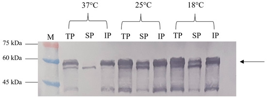 Effect of different incubation temperatures (37 °C, 25 °C and 18 °C) on the NVC-3xAvM2e protein’s solubility. TP, total protein; SP, soluble protein; IP, insoluble protein; lane M, PM2510 protein ladder marker (SMOBIO Technology Inc., Baoshan Township, Hsinchu City, Taiwan). Arrow indicates the size of the expressed NVC-3xAvM2e at 53.9 kDa.