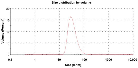 TEM revealed that the purified NVC-3xAvM2e protein formed VLPs of ~25 nm in diameter (Figure 8), slightly smaller than the NVC VLPs (27 nm) [15]. The size observed under TEM was also smaller than that determined by DLS, which showed a hydrodynamic diameter peak at ~35.4 nm (Figure 9). Nevertheless, the NVC-3xAvM2e VLPs appeared intact and fairly monodisperse, consistent with DLS analysis, with a mean polydispersity index (PDI) of 0.198, indicating a homogeneous sample with uniformly sized particles.