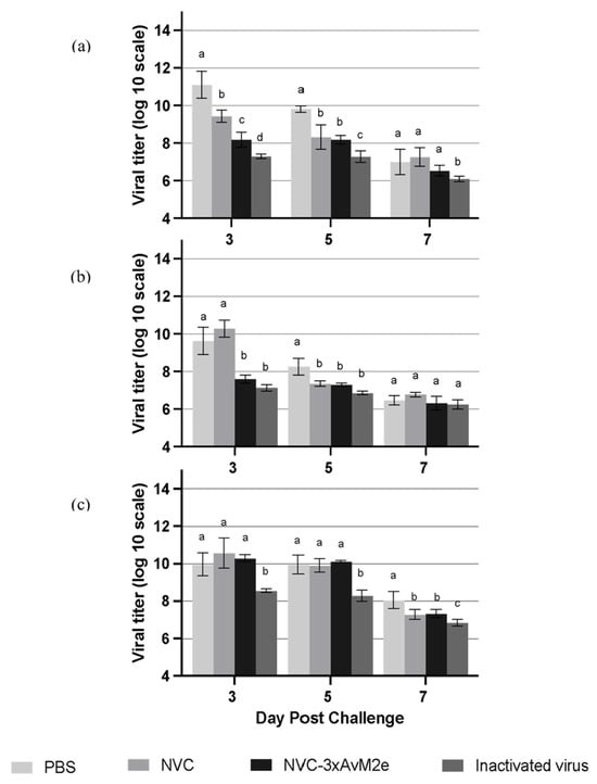 Viral tires of LPAI H9N2-challenged chickens (n = 3). Virus titres in the (a) lung, (b) cloacal swab, and (c) oropharyngeal swab were measured at days 3, 5, and 7 post-infection. Different letters denote statistically significant differences (p < 0.05) between groups, whereas shared letters indicate no significant differences within each time point. Error bars represent the mean ± standard error of triplicate measurements.