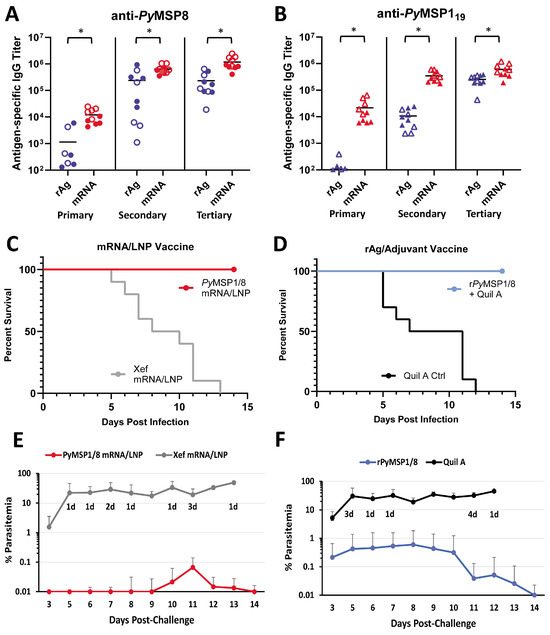 APA StyleOtt, A. C., Loll, P. J., & Burns, J. M., Jr. (2025). An mRNA Vaccine Expressing Blood-Stage Malaria Antigens Induces Complete Protection Against Lethal Plasmodium yoelii. Vaccines, 13(7), 702. https://doi.org/10.3390/vaccines13070702