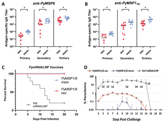 3.3. The Immunogenicity and Efficacy of the PyMSP1/8-Mem mRNA Vaccine Are Superior to the PyMSP1/8-Sec mRNA Vaccine When Administered at Low Dose