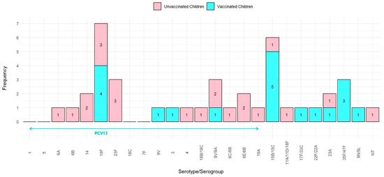 Overall, the pneumococcal carriage rate was similar between both groups; however, the specific S. pneumoniae serotypes differed, with a notable shift toward NVT serotypes in the vaccinated group.