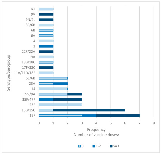3.4. Distribution of S. pneumoniae Serotypes in Children Based on the Number of PCV13 Doses