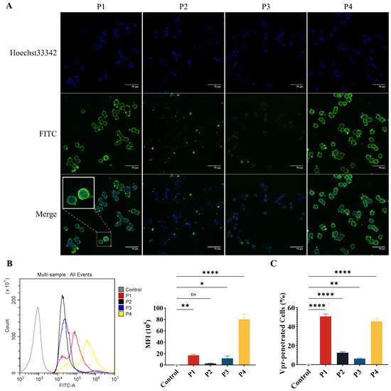 Next, flow cytometry was used to quantitatively analyze the mean fluorescence intensity (MFI) of FITC and the proportion of FITC+ Vpr-penetrated cells. The results showed that for the cells incubated with P1, the proportion of FITC+ cells was 97.34% and the MFI was 7.74 × 105, which were significantly higher than the control group. For the P4 group, the proportion of FITC+ cells was 90.93% and the MFI was 5.64 × 106, which were also significantly higher than the control group. Consistent with the results observed using CLSM, P1 and P4 exhibited strong membrane penetration ability. The proportion of FITC+ cells was only 12.57% for the P2 group and 6.317% for the P3 group, suggesting that the membrane penetration ability of P2 and P3 is much weaker than that of P1 and P4 (Figure 2B,C). These results demonstrate that P1 and P4 have membrane penetration functions and can effectively penetrate the tumor cell membrane to exert their effects inside the cells.