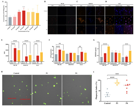 Based on the results observed using CLSM, to investigate whether Vpr peptides can induce the release of tumor antigens, we used the membrane antigen EGFR as a representative and evaluated the EGFR level in the cell culture supernatants of HT-29 tumor cells treated with Vpr peptides using an ELISA. The results showed that compared to the control group, the cell culture supernatants of the P1 and P4 treatment groups had higher levels of EGFR, indicating that P1 and P4 promoted the release of tumor cell membrane antigens (Figure 3A). To investigate whether Vpr peptides can induce ICD in tumor cells, we used three tumor cell lines with different immunogenicity, MC38, B16F10, and LLC [53], and evaluated the three hallmarks of ICD, namely, CRT, ATP, and HMGB1 after Vpr peptide treatment. The results showed that after 24 h of P1 and P4 treatment, clear CRT exposure was observed on the surface of all three tumor cell lines (Figure 3B–D). Concurrently, the CRT exposure on the tumor cell surface was also quantitatively analyzed using flow cytometry. Compared to the control group, the CRT signal on the tumor cells was significantly increased after P1 and P4 treatment (Figure 3E). The changes in the secretion level of ATP from tumor cells were evaluated using an ATP assay kit. The results showed that the ATP levels in the cell supernatants of the P1 and P4 treatment groups were significantly increased in MC38 and LLC cells, indicating that P1 and P4 can promote the secretion of ATP from tumor cells, and the effect of P1 was stronger than that of P4 (Figure 3F). The changes in the secretion of HMGB1 from tumor cells were evaluated using an ELISA. The results showed that the cell supernatants of the P1 and P4 treatment groups for MC38 and LLC cells had higher levels of HMGB1, indicating that P1 and P4 can promote the secretion of HMGB1 from MC38 and LLC tumor cells (Figure 3G). However, the ATP and HMGB1 in the culture supernatant of the B16F10 cells showed no significant changes following Vpr peptide treatment; the underlying reason for this remains to be explored.