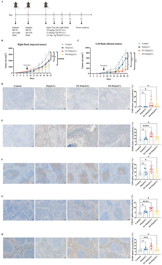 The Vpr peptide vaccine in situ inhibited MC38 tumor growth and activated anti-tumor immunity. (A) Treatment scheme. Mice were inoculated in the right flank with MC38 cells on day 0. After 4 days, MC38 cells were implanted into the left flank to simulate tumor metastasis. The mice were treated with intratumoral injections of 10 mg/kg P1or 15 mg/kg p4 in PBS, with a total volume of 50 μL, along with subcutaneous administration of 2.5 mg/kg of Poly(I:C) on days 8, 12, 15, and 19 (five mice per group, n = 5). Animals that died due to non-treatment-related causes prior to the study endpoints were excluded from statistical analysis. (B) Growth of tumors in the right flank. (C) Growth of tumors in the left flank. (D–H) IHC examination of CD8 (D), F4/80 (E) in right tumor tissue, and CD4 (F), CD11C (G), F4/80 (H) in spleen. Scale bar, 100 μm (n = 3, three scenes per sample). The data are presented as means ± SD, ns: no significance, * p < 0.0332, ** p < 0.0021, *** p < 0.0002, **** p < 0.0001.