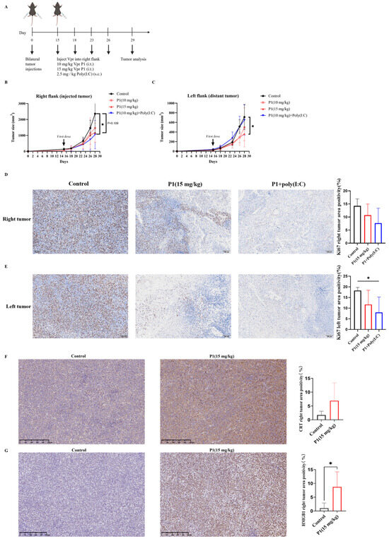 The Vpr peptide vaccine in situ inhibited LLC tumor growth. (A) Treatment scheme. Mice were inoculated in the right flank and left flank with LLC cells on day 0. The mice were treated with PBS, 10 mg/kg P1 or 15 mg/kg P1 (50 μL, intratumoral injection at right flank), or a combination of 10 mg/kg P1 (50 μL, intratumoral injection at right flank) and 2.5 mg/kg Poly(I:C) (subcutaneous injection) on days 15, 18, 23, and 26 (five mice per group, n = 5). Animals that died for reasons not related to administration before the endpoint were excluded from the statistics. (B) Growth of tumors in the right flank. (C) Growth of tumors in the left flank. (D,E) IHC examination of ki67 in right tumor tissue (D) and in left tumor tissue (E). Scale bar, 100 μm (n = 5). (F,G) IHC staining examination of CRT (F) and HMGB1 (G) in right tumor tissue. Scale bar, 250 μm (n = 5). (* p < 0.0332).