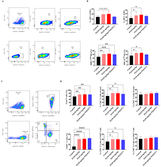 In both the MC38 and LLC models, abscopal anti-tumor effects of the Vpr peptide were observed. To further investigate the immunological basis of this abscopal effect, we analyzed the tumor antigen presentation process using flow cytometry. The analysis of DCs in the draining lymph nodes (dLNs) of mice treated with Vpr peptide P1 showed that, compared to the control group, the proportions of cDC1 and cDC2 subsets within the DC population were increased to different extents in both the P1 monotherapy and the P1 + Poly(I:C) groups (Figure 6A,B). Additionally, the proportions of MHC Ihigh DCs and MHC IIhigh DCs were significantly elevated in the P1 (15 mg/kg) and P1 (10 mg/kg) groups, indicating that the Vpr peptide promoted the maturation of DCs in the lymph nodes and enhanced their ability to present tumor antigens (Figure 6A,B). Corresponding to the increases in cDC1 and cDC2, we also analyzed the activation status of T cells in the dLNs. The results showed that the proportions of total T cells and CD69+-activated T cells were significantly higher in the P1 monotherapy group and P1 + Poly(I:C) group compared to the control group, suggesting that the Vpr peptide promoted the recruitment and activation of T cells in the dLNs (Figure 6C,D). The increases in the proportions of CD4+ T cells were greater than those of CD8+ T cells, which is consistent with the more pronounced increase in cDC2 than cDC1 (Figure 6C,D). These results indicate that the ISV with Vpr peptide effectively activated DCs in the peripheral lymph nodes and enhanced their antigen presentation function, thereby activating both CD4+ and CD8+ T cells. On the other hand, macrophages also participate in the tumor antigen presentation process, so we analyzed the macrophages in the spleen and tumor. Compared to the control group, the 15 mg/kg P1 monotherapy and the P1 + Poly(I:C) groups showed increased proportions of macrophages in the spleen and both right and left tumors, with a certain degree of increase in the proportion of MHC II+ M1-type antigen-presenting macrophages, although the magnitude was not as significant as the increases in DCs in the dLNs (Figure S1A,B). In summary, the ISV with Vpr peptide was able to activate antigen-presenting cells, including DCs in the lymph nodes and macrophages in the tumor and periphery, by inducing tumor antigen release and ICD, thereby promoting the presentation of tumor antigens and facilitating the recruitment and activation of T cells to elicit a systemic anti-tumor immune response.