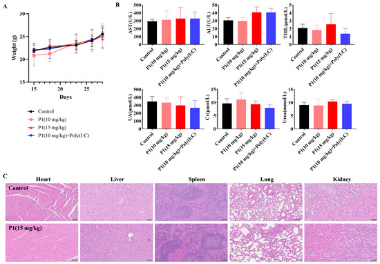After verifying the tumor inhibition and immune activation effects of the Vpr peptide, the safety of the Vpr peptide was also an important issue that needed to be addressed. We conducted a general toxicity evaluation of the Vpr peptide in situ vaccine by monitoring mouse body weight changes, histological examination of major organs, and blood biochemical indicators. The mice maintained stable weight gain throughout the dosing period, without any significant individual weight loss, preliminarily indicating that the Vpr peptide had no obvious toxicity in mice (Figure 7A). The P1 monotherapy or P1 + Poly(I:C) did not have a significant impact on the kidney function indicators (UA, CRE, URE), indicating that the Vpr peptide did not have obvious kidney toxicity (Figure 7B). While most treatment groups showed comparable AST, ALT, and BIL levels to the controls, a moderate increase in ALT was observed in the P1 15 mg/kg and P1 + adjuvant groups (Figure 7B). These values remained within the normal clinical physiological range, suggesting no significant hepatotoxicity [58]. After the dosing was completed, the major organs (heart, liver, spleen, lung, and kidney) of the mice were subjected to H&E staining to evaluate any organ damage caused by the Vpr peptide. Compared to the control group, the 15 mg/kg P1 treatment group did not show any significant tissue damage or pathological changes in the heart, liver, spleen, lung, and kidney (Figure 7C). In summary, our preliminary results provide evidence supporting the favorable safety profile of the Vpr peptide in situ vaccine. These findings suggest that the utilization of Vpr peptide for therapeutic purposes may potentially mitigate associated risks.