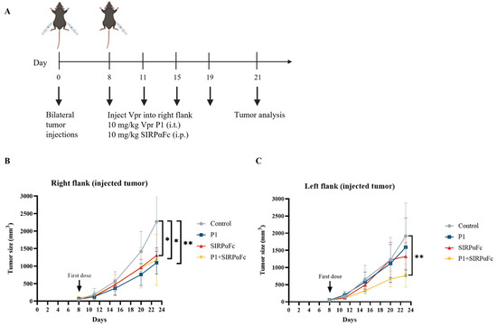 The combination of Vpr peptide and SIRPαFc inhibited the growth of the distant tumor. (A) Treatment scheme. Mice were inoculated in the right flank and left flank with LLC cells on day 0. The mice were treated with intratumoral injections (right flank) of 10 mg/kg P1 or/and 10 mg/kg SIRPαFc (i.p.) on days 8, 11, 15, and 19 (five mice per group, n = 5). Animals that died of causes unrelated to the administration before the experimental endpoint were excluded from the statistics. (B) Growth of tumors in the right flank. (C) Growth of tumors in the left flank. The data are presented as the mean ± SD, * p < 0.0332, ** p < 0.0021.