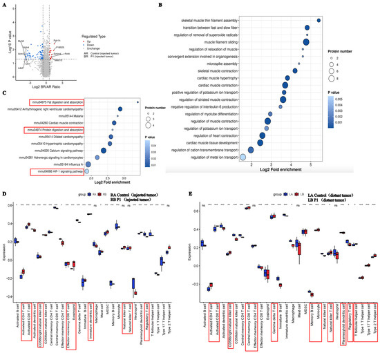 Proteomic analysis to explore the mechanism of anti-tumor activity of Vpr peptide. (A) Volcano plot showed the differentially expressed genes between the P1 treatment group and control group. (B,C) GO analysis (B) and KEGG (C) analysis for the genes significantly downregulated by P1 compared to the control. (D,E) The identification of immune gene sets in injected tumor (D) and distant tumor (E) using ssGSEA. * p < 0.05, ** p < 0.01, *** p < 0.001.