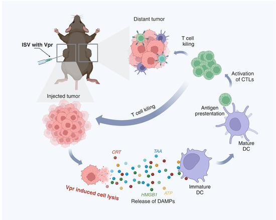 Schematic description of the mechanism of the ISV with Vpr peptides. (1) In the injected tumor, Vpr peptides induce ICD of tumor cells, characterized by surface exposure of CRT, release of HMGB1 and ATP, and liberation of TAAs. (2) The released DAMPs and TAAs promote phagocytosis of dying tumor cells by DCs and induce DC maturation. (3) Mature DCs migrate to draining lymph nodes and present tumor antigens to CD8+ and CD4+ T cells via MHC I and II molecules, respectively. (4) Activated tumor-specific T cells enter circulation and infiltrate both injected and distant tumor sites to exert anti-tumor effects. (Created in BioRender. Pan, D. (2025) https://BioRender.com/gcgn22a (accessed on 5 June 2025)).