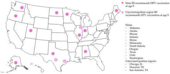 U.S. jurisdictions recommending HPV vaccination at age 9 in IISs as of June 2025.