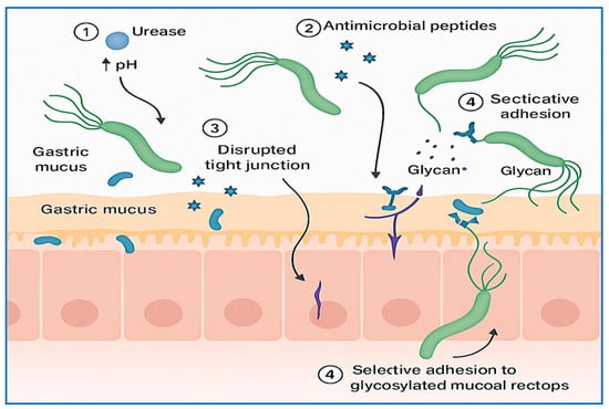 - Fan, J.; Zhu, J.; Xu, H. Strategies of Helicobacter pylori in evading host innate and adaptive immunity: Insights and prospects for therapeutic targeting. Front. Cell. Infect. Microbiol. 2024, 14, 1342913. [Google Scholar] [CrossRef]