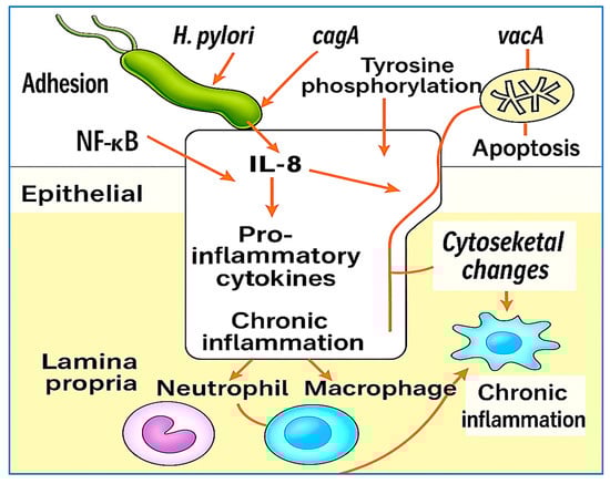 - Kusters, J.G.; Van Vliet, A.H.; Kuipers, E.J. Pathogenesis of Helicobacter pylori infection. Clin. Microbiol. Rev. 2006, 19, 449–490. [Google Scholar] [CrossRef] [PubMed]