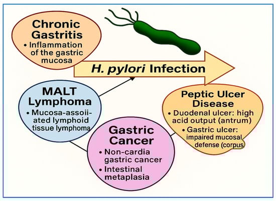 - Lee, Y.-C.; Dore, M.P.; Graham, D.Y. Diagnosis and treatment of Helicobacter pylori infection. Annu. Rev. Med. 2022, 73, 183–195. [Google Scholar] [CrossRef]