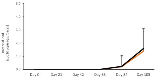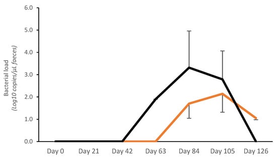 Average Lawsonia intracellularis shedding in feces in vaccinated pigs (orange) and control pigs (black). Average Area Under the Curve (bacterial shedding Log10 copies/μL) from day 0 to day 126 was significantly lower for vaccinates (20.72 ± 25.93) compared with controls (40.23 ± 39.10) (p < 0.05).