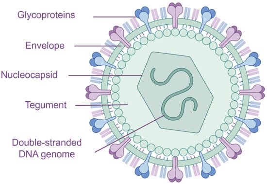 Varicella-zoster virus (VZV), also known as human herpesvirus 3 (HHV-3), belongs to the Herpesviridae family and the Alphaherpesvirinae subfamily. This nearly spherical, enveloped virus measures 150–200 nm in diameter and contains double-stranded DNA. Its structural components include nucleocapsid proteins and a lipoprotein envelope (Figure 1). The VZV genome consists of 124,884 base pairs (bp) and encodes at least 70 genes, organized into two covalently linked segments: a long (L) segment and a short (S) segment [1]. The nucleocapsid forms an icosahedral structure with 162 capsomeres, while the viral envelope is enriched with glycoproteins, including gB (ORF31), gC (ORF14), gE (ORF68), gH (ORF37), gI (ORF67), gK (ORF5), gL (ORF60), gM (ORF50), and gN (ORF50) [2]. These glycoproteins play vital roles in the viral life cycle and interactions with the immune system.
