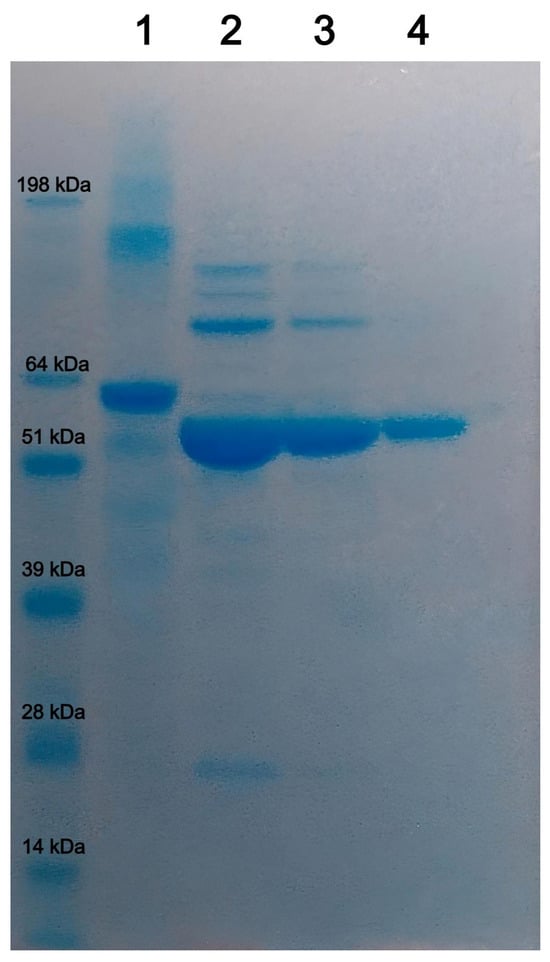 SDS-PAGE and Coomassie gel staining of purified rEVP60-His6 protein; recombinant protein elution fractions (lanes 2–4); bovine serum albumin—2 μg (lane 1); protein standard molecular weight is reported.