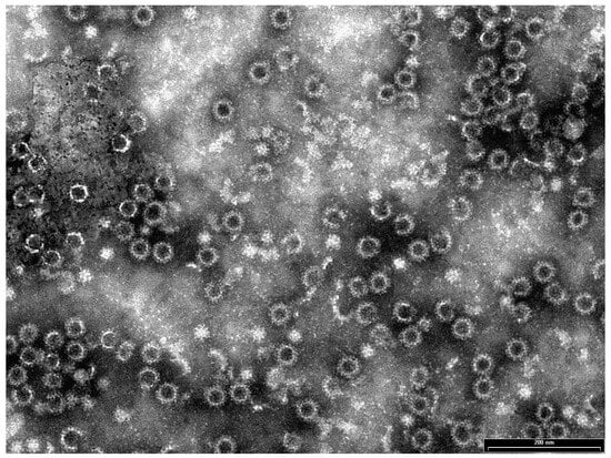To confirm the presence of VLPs, purified EVP60-His6 was adsorbed onto 400 MESH copper grids (QUANTIFOIL® Micro Tools GmbH, Jena, Germany) for 4 min. The sample was negatively stained with a 2% NaPT solution (Merck, Kenilworth, NJ, USA) at pH 6.9 for 1 min. Excess fluid was removed with blotted paper, and the sample was left to air dry. The grids were observed with a CM12 STEM electron microscope (Philips, Eindhoven, The Netherlands) operating at 80 kW. VLPs were identified based on their morphological characteristics.
