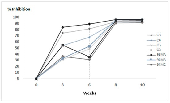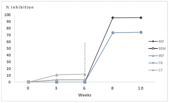 Blood samples were collected at 0, 3, 6, 8 and 10 weeks after the first immunisation and stored at −20 °C. All the collected sera were diluted 1:10, and the detection of specific anti-EBHSV antibodies was performed using a competitive ELISA set up at the WOAH Reference Laboratory for RHD at IZSLER [14,43,44].