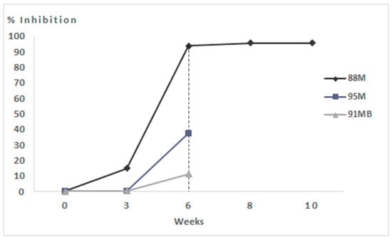 The results obtained after the immunisation of hares with 50 µg of VLPs were difficult to interpret. Although lesions were found on necropsy and histological examination (Figures S2 and S6), virological tests on the target organ were negative. Moreover, hare 95M, which showed weak seroconversion after booster, probably died for EBHSV. In fact, the viral genome detection yielded positive results by Real-Time PCR in the spleen (Ct 32) and faintly detectable in the liver (Ct 39), in contrast to what was expected. Such a situation is typical of the chronic, prolonged course of the disease when the viral clearance occurs mainly in the splenic reticuloendothelial cells. This justifies the recommendation to always test the spleen, besides the liver, to diagnose EBHS. In fact, the frequency of chronic course of EBHS in hares is much higher than in rabbits infected with RHDV [43,44]. The 91MB and 88M hares showed negative results for EBHSV, but the latter was the only one of that group who responded to the VLPs-based vaccine with a consistent seroconversion after booster and survived the challenge. This situation could be due to the low antigen dose that caused insufficient seroconversion to prevent EBHS infection following challenge by the intramuscular route.