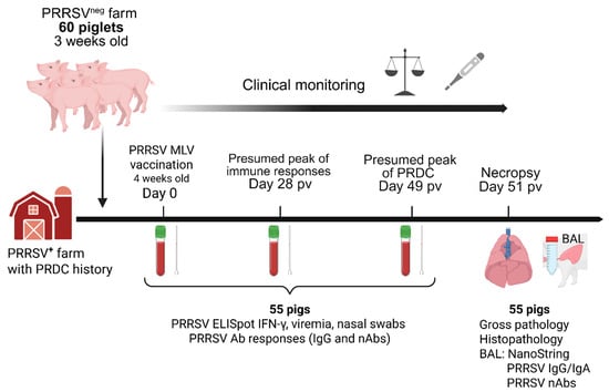 Study design. Sixty commercial Yorkshire 3-week-old piglets balanced by sex were selected from a PRRSV-negative herd and introduced into a farm with history of porcine respiratory disease complex (PRDC). Animals were vaccinated intramuscularly with 2 mL of Ingelvac® PRRSV-2 modified live virus (MLV) vaccine at 4 weeks of age. Serum, whole-blood, and nasal swabs were collected prior to vaccination (0 days post vaccination, dpv), at 28 dpv and when PRDC was expected (49 dpv). At 51 dpv, animals were euthanized, and lungs were harvested. Lungs were flushed with 1× PBS to collect the bronchoalveolar lavage (BAL), and a total of five lung samples were taken for histopathology. ELISpot IFN-γ, viremia, shedding and antibody responses were analyzed at day 0, 28 and 49. NanoString and antibody responses were performed in BAL at 51 dpv. Partial sampling was performed on five pigs that succumbed during the experimental process. Created in BioRender. Crisci, E. (2025) https://BioRender.com/1r8uij0.