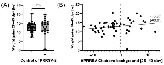 Correlation analyses of PRRSV-2 viremia with weight gain. (A) Weight gains of pigs that did not control or did control PRRSV-2 infection (ΔCt from 28 to 49 dpv < 2). (B) Spearman correlation analysis between weight gains and the control of PRRSV-2 infection as defined by a reduction in Ct levels above background from 28 to 49 dpv. Statistical analysis was performed using an unpaired t-test. ns = p > 0.05.