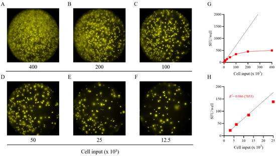 Establishing the frequency of S-antigen-specific Bmem-derived IgG+ ASCs using a serial dilution approach. PBMCs from a healthy human subject, collected in the post-COVID era, were tested in an ImmunoSpot® assay using a two-fold serial dilution approach to determine the frequency of SARS-CoV-2 S-antigen-specific IgG+ ASCs following 5 days of in vitro polyclonal stimulation. (A–F) Representative well images are shown for each of the specified cell inputs. Note: crowding of spot-forming units (SFUs) and elevated background membrane staining resulting from an ELISA effect were present in wells input with >1 × 105 PBMCs. (G) SFU counts per well (red symbols) vs. cell input over the entire cell dilution range tested. Deviation from linearity was evident at values >100 SFUs per well, denoted by the dashed line, representing the theoretical linear relationship between SFU counts and PBMCs plated. (H) Linearity between SFU counts and cell input in wells seeded with <2.5 × 104 PBMCs; R2 value denotes the goodness of fit of the data. Notably, for this particular donor and antigen combination the mean SFU count from the 2.5 × 104 PBMC input underestimated the frequency of S-antigen-specific IgG+ ASCs, denoted in parentheses as the number of S-antigen-specific IgG+ ASCs per 106 PBMCs. Note: refer to Supplemental Figure S4 in which the linearity between cell input and SFU counts is shown for an additional 11 test subjects.