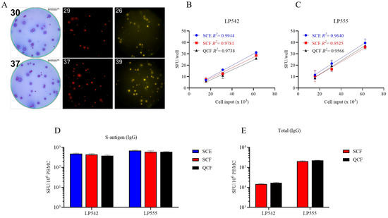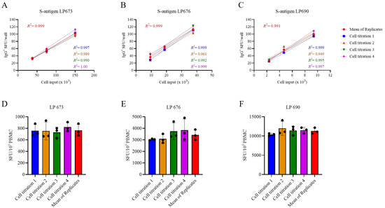 Simple linear regression analysis using GraphPad Prism 10 Version 10.4.0 (San Diego, CA, USA) was performed to calculate R2 values and generate the corresponding trend lines. An analysis of variance (ANOVA) with Bonferroni correction for multiple comparisons was performed to compare the frequencies of S-antigen-reactive IgG+ ASCs determined using SFU counts originating from the individual serial dilutions performed in singlet or the mean SFU count at each cell input tested in quadruplicate. The mean, standard deviation (SD), and coefficient of variation (expressed as a percentage) between S-antigen-reactive IgG+ ASC frequency assessments were calculated using Excel (Microsoft Office 365).