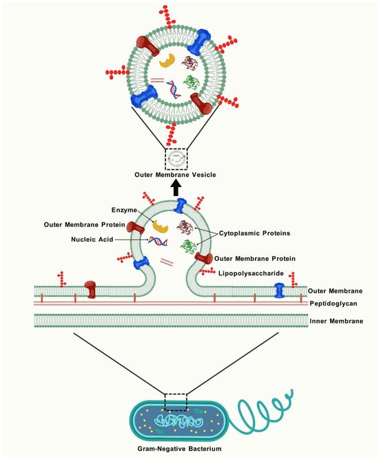 Living organisms naturally secrete biomolecules such as polysaccharides, proteins, and various chemical compounds, either directly or through indirect pathways, to support their physiological functions [1]. In addition to the direct release of certain cellular components, numerous factors are released in the form of vesicles, suggesting that these vesicles could significantly influence various biological functions. Outer-membrane vesicles (OMVs) spontaneously bud from the cell envelope of Gram-negative bacteria [2]. OMV generation was initially documented in 1965 in an auxotrophic strain of Escherichia coli that emitted substantial quantities of cell-free LPS under lysine-deficient growth settings [3]. Subsequently, Knox and colleagues reported that the released cell-free LPS components were integral to membrane structures, and they hypothesized that these vesicles originate from the outer membrane [4]. Rothfield and Pearlman-Kothencz further showed that chloramphenicol exposure and amino acid deprivation enhanced outer membrane blebbing in E. coli [5]. Following that, studies documented the observation and separation of OMVs from various Gram-negative bacteria, including Veillonella parvula [6], Vibrio cholerae [7], and Salmonella enterica ser. Typhimurium [5]. Notwithstanding the mounting evidence of OMV generation by bacteria, OMVs were regarded as trivial artefacts of growth or by-products of cell lysis for many years. Finally, OMVs were detected in cerebral fluid samples from patients with acute meningitis, indicating that OMVs are not exclusively produced in laboratory settings [8]. Since then, the synthesis of OMVs and their functions have garnered significant interest.
