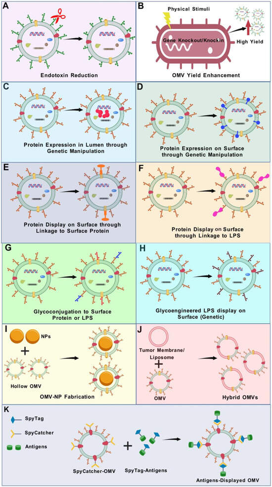 OMVs are a versatile tool for genetic modification and bioengineering in the design of effective vaccines. OMVs can be bioengineered for the following purposes: (A) Minimizing the ability of LPS to trigger a reactogenic response following OMV injection [189,190,191]. (B) Enhancing the natural ability of Gram-negative bacteria to release OMVs [192]. (C) Expressing antigens in the lumen of OMVs [193]. (D) Expressing various protein or peptide antigens on the surface through genetically modifying the parent bacteria [186]. (E) Linking externally purified protein antigens with the surface proteins of OMVs [194,195]. (F) Linking externally purified protein antigens with the surface LPS of OMVs [196]. (G) Conjugating polysaccharide-based antigens through fusion with surface proteins or LPS [197,198]. (H) Genetically modifying the parent bacteria to express polysaccharide antigens [199]. (I) Coating nanoparticles (NPs) with OMVs [200]. (J) Preparing hybrid OMVs through the fusion of OMVs with tumour or plant membranes or liposomes [201]. (K) SpyTag/SpyCatcher system for antigen display [202]. LPS: lipopolysaccharide; NP: nanoparticles; OMV: outer-membrane vesicle.