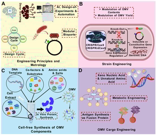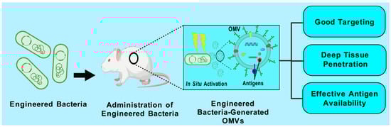 Not all bacteria produce OMVs; therefore, strategies are needed to develop a universal OMV platform for displaying antigens from unrelated pathogens. In addition, OMV cargo differs among strains, which may in certain instances restrict its usefulness to a certain subset of strains. Moreover, numerous strains release minimal quantities of OMVs, indicating that substantial volumes of parent bacteria are required to obtain a good OMV yield. Over the past decade, the bioengineering of bacteria that produce OMVs has significantly advanced to tackle such issues. Recombinant DNA technology significantly expedited the investigation of OMVs in biomedical and other domains. Recently, OMVs have emerged as promising platforms for delivering heterologous antigens [186]. They can be engineered to present proteins or polysaccharides from a variety of pathogens, including viruses, bacteria, and parasites, even those that are phylogenetically unrelated. OMVs can be adorned with heterologous functional components to act not only as antigens, but also as carriers and adjuvants in vaccine formulation.