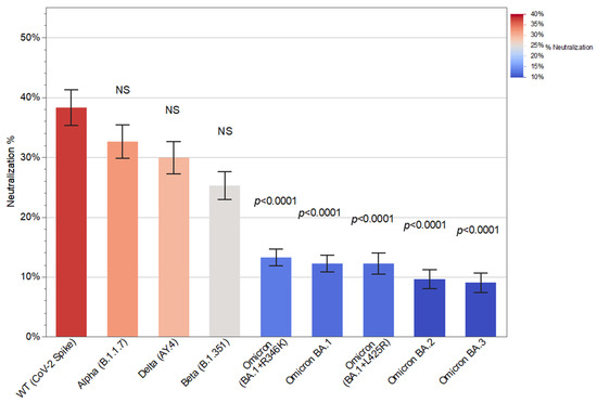 Compared with the WT strain, the neutralizing activity of patient antibodies was significantly lower against all the Omicron variants examined (p < 0.0001; Kruskal–Wallis followed by Dunn’s) but not against any of the other variants: Alpha (B.1.1.7), Beta (B.1.351), or Delta (AY.4). This indicates severely diminished protection against Omicron variants (Figure 3).
