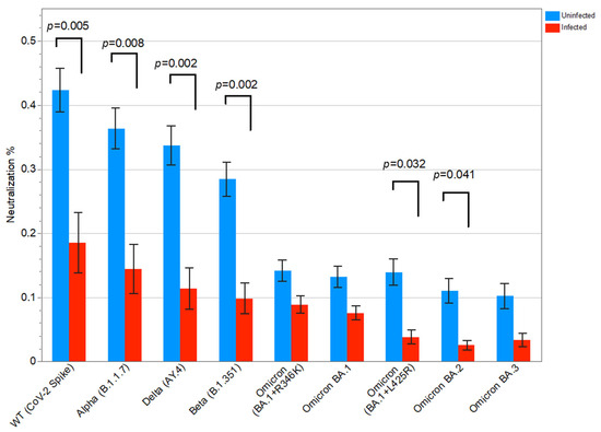 Antibody-mediated neutralization (%) compared between kidney transplant recipients (KTRs) with and without SARS-CoV-2 breakthrough infection using the Mann–Whitney test for each variant of SARS-CoV-2. The p-values not shown were non-significant (mean; SEM); WT, wild-type.