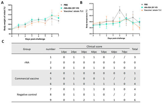Immunization with rNA-ISA 201 VG and commercial vaccine (strain TJ) reduced clinical signs in pigs caused by SIV infection. (A) Changes in body weight in pigs challenged with SIV for 7 days after virus infection. (B) Changes in rectal temperature in pigs challenged with SIV for 7 days after virus infection. (C) The clinical symptoms score of pigs challenged with SIV for 7 days after virus infection. Coughing/nasal discharge/sneezing/dyspnea are each scored 1 mark. “0” indicates no clinical symptoms. “/” indicates no content. Pigs No. 1, No. 5, and No. 8 were examined by autopsy on day 5 after the challenge, so there were no records of clinical symptoms on day 6 and day 7 after the challenge.