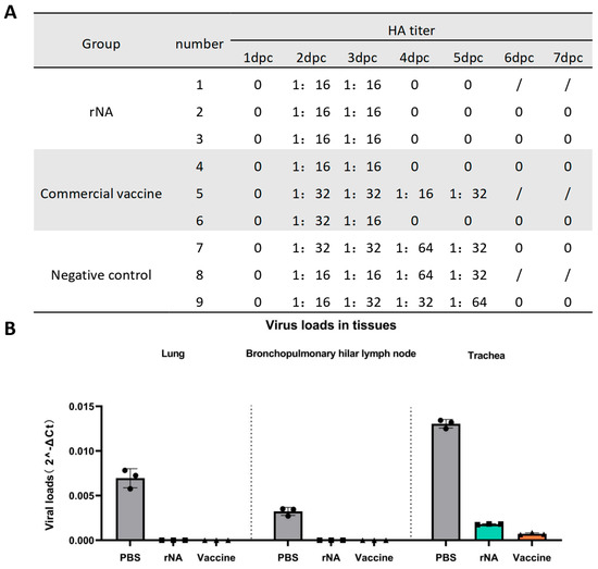 Nasal swab samples were collected daily for 7 days post-challenge for viral isolation in MDCK cells and HA titer determination using 1% chicken erythrocytes. All groups of pig nasal swabs were positive for viral isolation and HA titers ≥ 1:16 on day 2 post-challenge with the homologous virus (Figure 4A). Viral replication in nasal swabs was detectable from day 2 post-challenge in all groups (Figure 4A). Notably, neither the rNA group nor the commercial vaccine group (except for pig No. 5) yielded isolatable virus in nasal swabs after day 4 post-challenge, whereas the negative control group maintained viral replication until day 6 post-challenge (Figure 4A). The above results indicated that immunization with rNA-ISA 201 VG and commercial vaccine could effectively inhibit SIV replication and shorten the viral shedding time of the pigs after the challenge, and the effect of rNA-ISA 201 VG was better than that of the commercial vaccine.