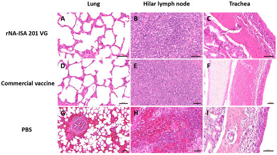 The histopathology assay of respiratory tissues of pigs with SIV challenge. (A–C) The HE of lung, hilar lymph node, and trachea in the rNA group. Scale bar = 50 μm. (D–F) The HE of lung, hilar lymph node, and trachea in the commercial vaccine group. Scale bar = 50 μm. (G) Significant hemorrhage and inflammatory cell infiltrate in the lungs of the PBS negative group. Scale bar = 100 μm. (H) Significant hemorrhage in the bronchopulmonary hilar lymph node of the PBS negative group. Scale bar = 50 μm. (I) Tracheal cilia shedding, with infiltration of macrophages and lymphocytes in the trachea of the PBS negative group. Scale bar = 50 μm. The images depict the results based on one pig per group.