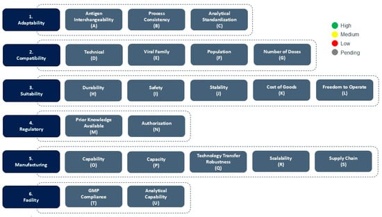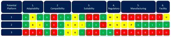| Regulatory | Prior Knowledge | Is prior knowledge from the platform available to support regulatory authorization? Red—there is no prior knowledge of the platform available to support regulatory authorization; Yellow—there is limited prior knowledge of the platform available to support regulatory authorization; Green—significant prior knowledge is available to support regulatory authorization. |