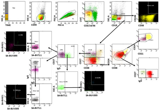 33. Weskamm, L.M.; Dahlke, C.; Addo, M.M. Flow cytometric protocol to characterize human memory B cells directed against SARS-CoV-2 spike protein antigens. STAR Protoc. 2022, 3, 101902. [Google Scholar] [CrossRef] [PubMed]