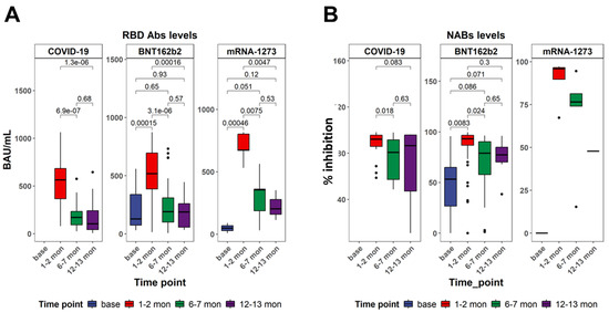 Figure 2. SARS-CoV-2-specific antibody responses in the studied subjects. (A) Comparison of the levels of anti-RBD IgG antibody at different time points within each cohort. (B) Comparison of the levels of NAB at different time points within each cohort. All p-values are from two-sided unpaired t-tests. p-values below 0.05 were considered statistically significant. Abbreviations: BAUs/mL—binding antibody units per ml. Black dots indicate individual data points plotted as outliers.