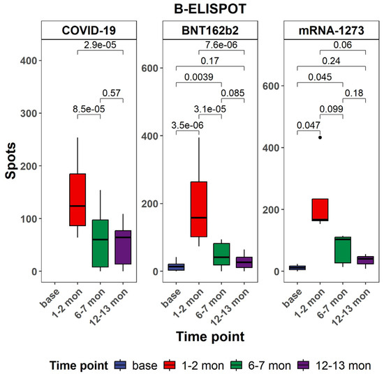 Figure 3. Comparison of B-ELISpot results at different time points within each cohort. All p-values are from two-sided unpaired t-tests. p-values below 0.05 were considered statistically significant. Black dots indicate individual data points plotted as outliers.