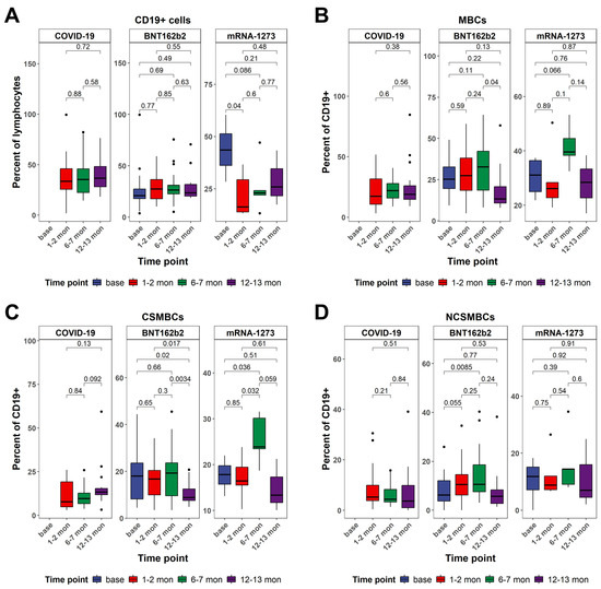 Figure 4. Dynamics in the frequency of peripheral B cells as determined by multiparametric flow cytometry analysis. (A) Comparison of the frequency of CD19+ cells at different time points within each cohort. (B) Comparison of the frequency of memory B cells at different time points within each cohort. (C) Comparison of the frequency of class-switched memory B cells at different time points within each cohort. (D) Comparison of the frequency of non-class-switched memory B cells at different time points within each cohort. All p-values are from two-sided unpaired t-tests. p-values below 0.05 were considered statistically significant. Black dots indicate individual data points plotted as outliers.