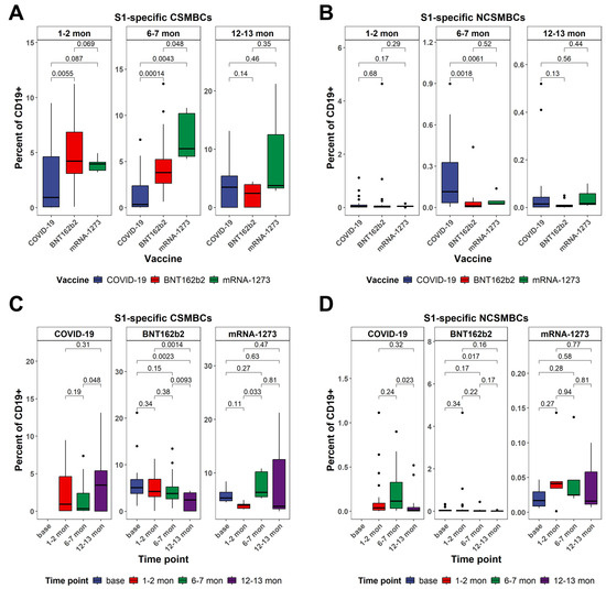 Figure 5. Dynamics in the frequency of S1-specific peripheral B cells as determined by multiparametric flow cytometry analysis. (A) Comparison of the frequency of S1-specfic class-switched memory B cells between different cohorts after stratification to three different time points. (B) Comparison of the frequency of S1-specfic non-class-switched memory B cells between different cohorts after stratification to different time points. (C) Comparison of the frequency of S1-specfic class-switched memory B cells at different time points within each cohort. (D) Comparison of the frequency of S1-specfic non-class-switched memory B cells at different time points within each cohort. All data in (AD) are from the same dataset. All p-values are from two-sided unpaired t-tests. p-values below 0.05 were considered statistically significant. Black dots indicate individual data points plotted as outliers.