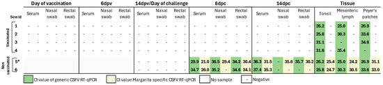 - Graham, S.P.; Everett, H.E.; Haines, F.J.; Johns, H.L.; Sosan, O.A.; Salguero, F.J.; Clifford, D.J.; Steinbach, F.; Drew, T.W.; Crooke, H.R. Challenge of Pigs with Classical Swine Fever Viruses after C-Strain Vaccination Reveals Remarkably Rapid Protection and Insights into Early Immunity. PLoS ONE 2012, 7, e29310. [Google Scholar] [CrossRef]