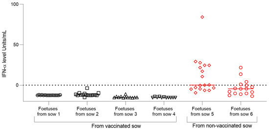 3.5. Lack of Humoral and Type I Interferon Responses in Fetuses from FlagT4G-Vaccinated Sows Following CSFV Challenge