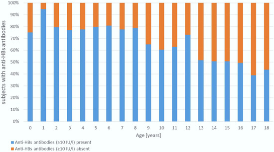 The proportion of children with seroprotective anti-HBs levels (≥10 IU/L) declined significantly with age (Mantel–Haenszel χ2 = 84.3, p < 0.001). Seropositivity exceeded 75% in children aged 1–8 years but decreased to 39–50% in adolescents aged 15–18 years.